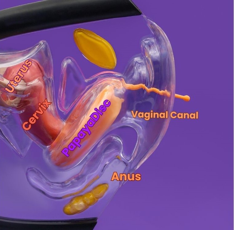 The menstrual disc is positioned correctly when it feels comfortable and secure without pressing or slipping. It should sit fully behind the cervix, collecting menstrual fluid without needing constant adjustment.