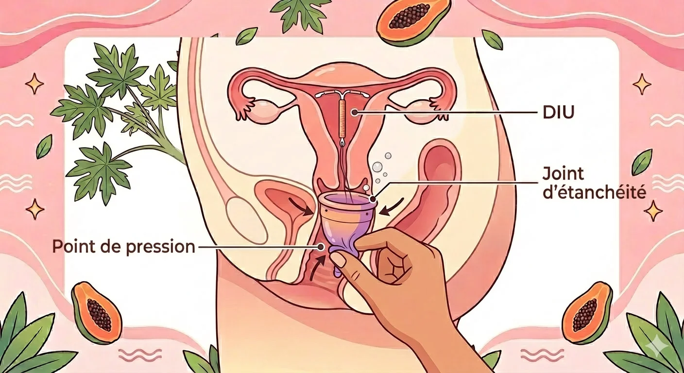 Le disque menstruel ne fonctionne pas par succion mais par position : il se place dans le fornix vaginal, derrière le pubis, et ne crée pas l'effet ventouse qu'une coupe crée. Cela élimine le principal mécanisme de risque associé au DIU.
